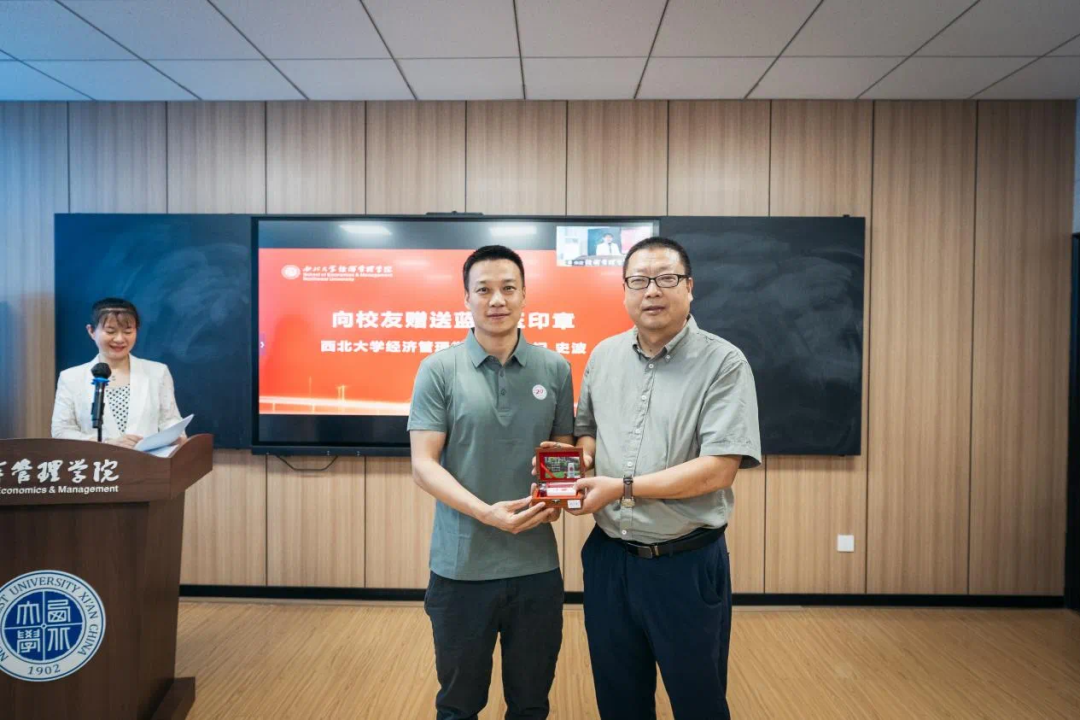 经济管理学院党委书记史波向返校校友颁赠蓝田玉印章。